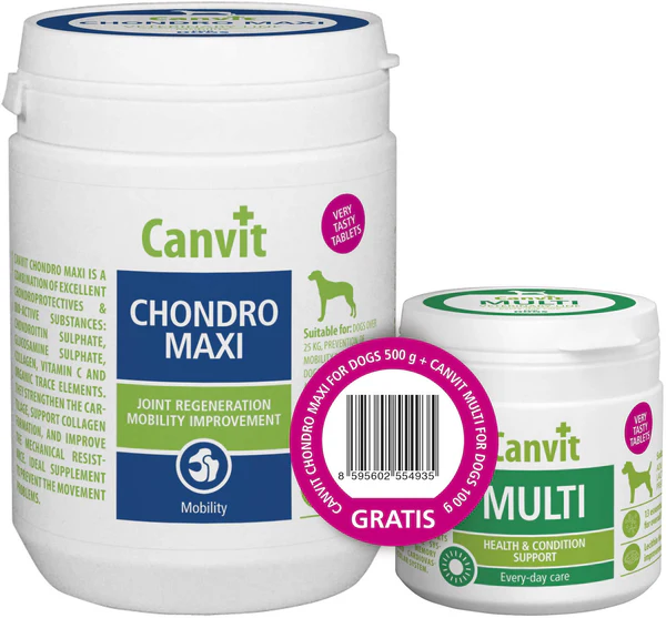 Canvit Chondro MAXI 500 g + Canvit Multi 100 g е внимателно подбран комбиниран пакет хранителни добавки за кучета, предназначен за цялостна грижа за опорно-двигателния апарат и оптималното общо здравословно състояние. Подходящ е както за профилактика, така и за интензивна подкрепа при вече съществуващи ставни проблеми.