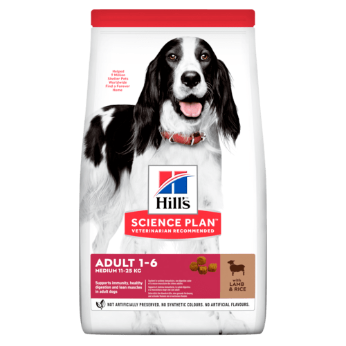 Храната HILL’S SCIENCE PLAN Adult е пълноценна храна за кучета от средните породи (11-25кг) от 1 до 6 години, с агнешко и ориз, специално формулирана да посреща енергийните нужди на кучетата в разцвета на годините им. Приготвена от висококачествени, лесно смилаеми съставки. Без добавени изкуствени консерванти, овкусители и оцветители. (Агне 9%; ориз 6%).