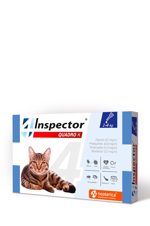 Inspector quadro K е предназначен за котки и котенца за лечение и профилактика на инвазии от кръвосмучещи насекоми, заразяване с уштни акари, нотоедрозна краста, инвазии с иксодидни кърлежи, стомашно-чревни нематодози (токсокароза, токсаскароза, унцинариоза, анкилостомоза), цестодози (инвазии с тении, дипилидиоза, алвеококоза), както и за профилактика на дирофилариоза.