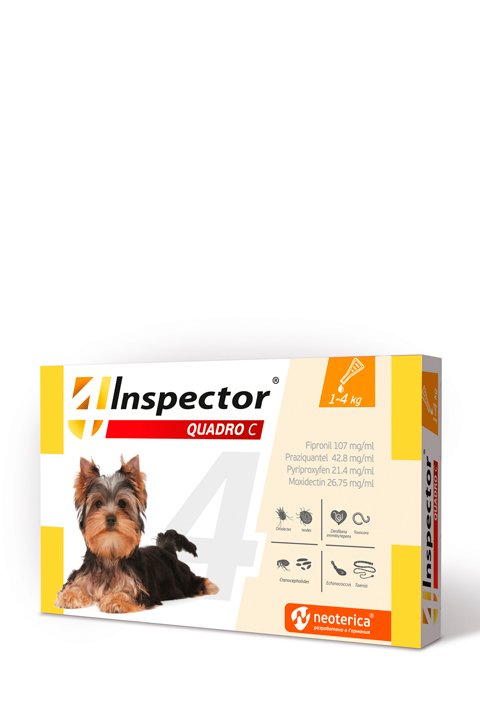 Inspector quadro С е предназначен за кучета и кученца за лечение и профилактика на инвазии от кръвосмучещи насекоми, демодекозна краста, заразяване с уштни акари, инвазии с иксодидни кърлежи, стомашно-чревни нематодози (токсокароза, токсаскароза, унцинариоза, анкилостомоза), цестодози (инвазии с тении, дипилидиоза, ехинококоза), комплексни нематодно-цестодни инвазии, както и за профилактика на дирофилариоза.