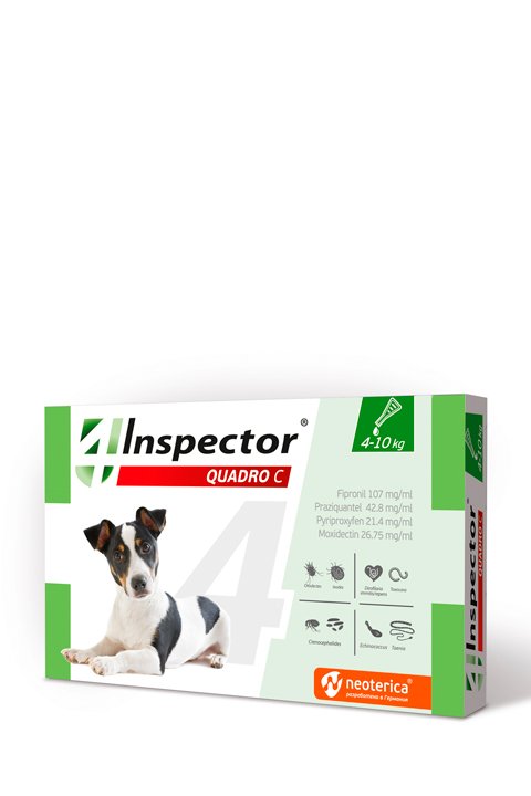 Inspector quadro С е предназначен за кучета и кученца за лечение и профилактика на инвазии от кръвосмучещи насекоми, демодекозна краста, заразяване с уштни акари, инвазии с иксодидни кърлежи, стомашно-чревни нематодози (токсокароза, токсаскароза, унцинариоза, анкилостомоза), цестодози (инвазии с тении, дипилидиоза, ехинококоза), комплексни нематодно-цестодни инвазии, както и за профилактика на дирофилариоза.