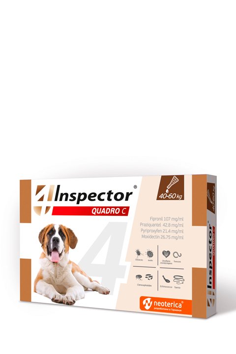 Inspector quadro С е предназначен за кучета и кученца за лечение и профилактика на инвазии от кръвосмучещи насекоми, демодекозна краста, заразяване с уштни акари, инвазии с иксодидни кърлежи, стомашно-чревни нематодози (токсокароза, токсаскароза, унцинариоза, анкилостомоза), цестодози (инвазии с тении, дипилидиоза, ехинококоза), комплексни нематодно-цестодни инвазии, както и за профилактика на дирофилариоза.