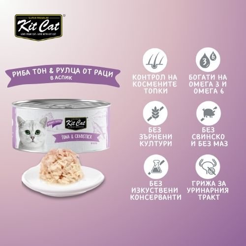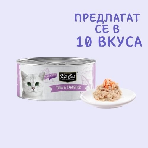 Kit Cat Deboned Toppers Tuna & Crabstick in Aspic – Допълваща храна за котки в зряла възраст, риба тон и рулца от раци в аспик (желе) 12 бр. х 80 гр.
