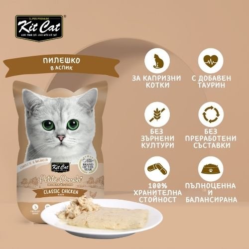 Kit Cat Petite Pouch Chicken in Aspic – Пълноценна и балансирана храна за котки в зряла възраст, пилешко в аспик (желе)