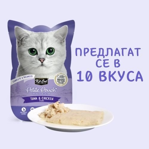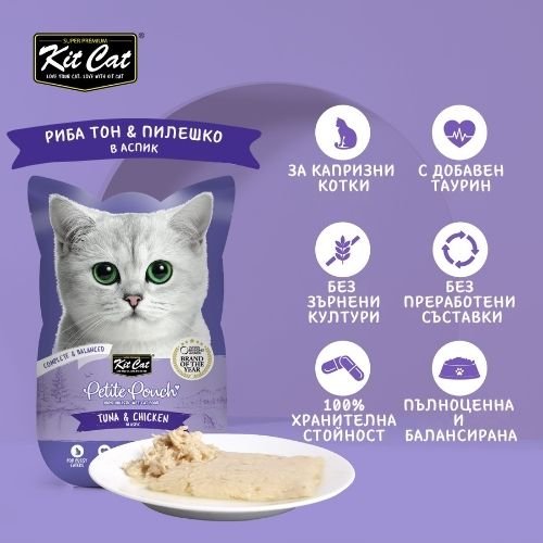 Kit Cat Petite Pouch Tuna & Chicken in Aspic – Пълноценна и балансирана храна за котки в зряла възраст, риба тон и пилешко в аспик (желе)