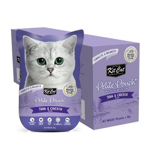 Kit Cat Petite Pouch Tuna & Chicken in Aspic – Пълноценна и балансирана храна за котки в зряла възраст, риба тон и пилешко в аспик (желе) 12 бр. х 70 гр.