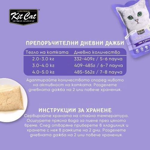 Kit Cat Petite Pouch е внимателно формулирана, за да осигури пълноценна и балансирана диета с висококачествени съставки, които удовлетворяват дори най-претенциозните котки. С високо съдържание на премиум протеини за задоволяване на хранителните нужди, както и добавени витамини и минерали за подпомагане на общото здраве.