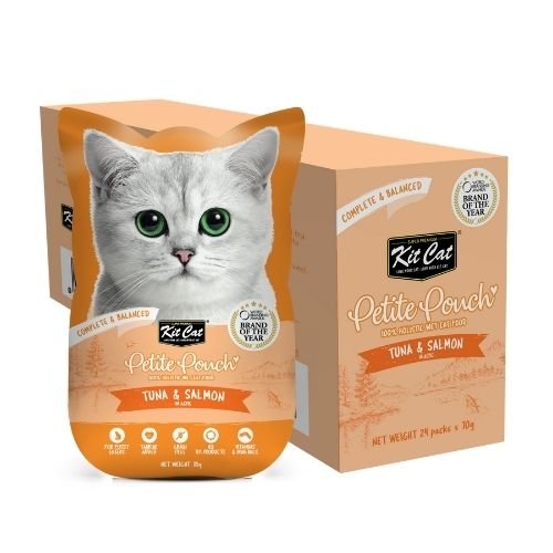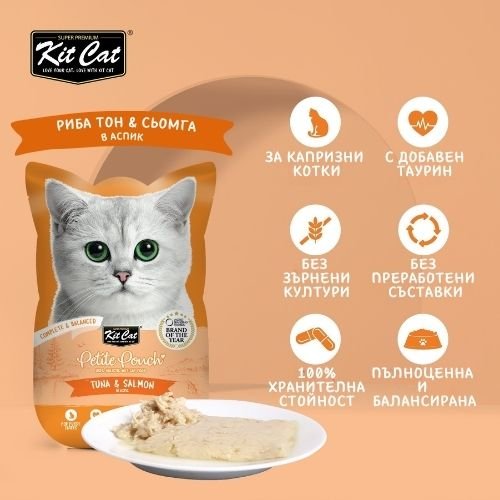 Kit Cat Petite Pouch Tuna & Salmon in Aspic – Пълноценна и балансирана храна за котки в зряла възраст, риба тон и сьомга в аспик (желе) 12 бр. х 70 гр.