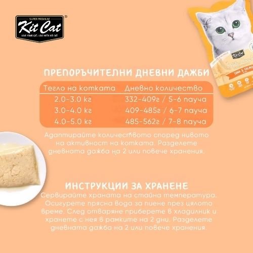 Kit Cat Petite Pouch е внимателно формулирана, за да осигури пълноценна и балансирана диета с висококачествени съставки, които удовлетворяват дори най-претенциозните котки. С високо съдържание на премиум протеини за задоволяване на хранителните нужди, както и добавени витамини и минерали за подпомагане на общото здраве.