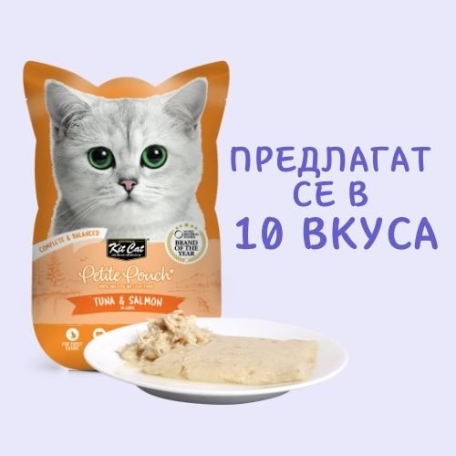 Kit Cat Petite Pouch Tuna & Salmon in Aspic – Пълноценна и балансирана храна за котки в зряла възраст, риба тон и сьомга в аспик (желе)