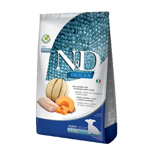 N&D Ocean Codfish, Pumpkin & Cantaloupe Melon Puppy MINI – суха храна без зърнени култури за подрастващи кученца от дребни породи, с риба треска, тиква и пъпеш