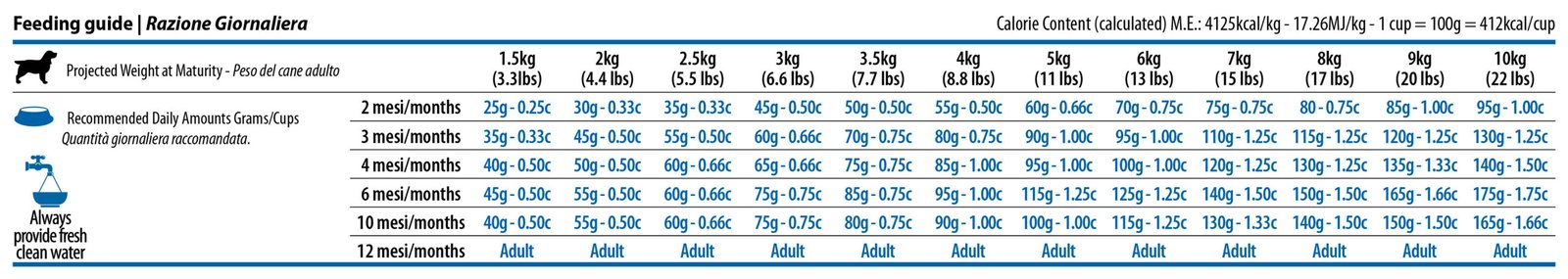 Аналитични съставки: суров протеин 35%; сурови мазнини 20%; сурови влакнини 1,90%; влага 9%; сурова пепел 8,5%; Калций 1,10%; Фосфор 0,91%; Омега-6 1,28%; Омега-3 2,50%; DHA 1,10%; EPA 0,80%; Глюкозамин 1400 mg / kg; Хондроитин сулфат 1100 mg / kg.