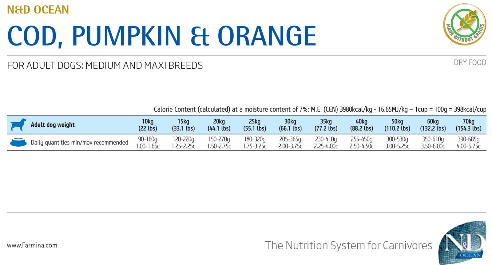 - N&D Grain Free е храна с нисък гликемичен индекс, защото е без съдържание на зърнени култури и позволява постепенно освобождаване на енергията през целия ден. Помага за предотвратяване на затлъстяване и диабет
