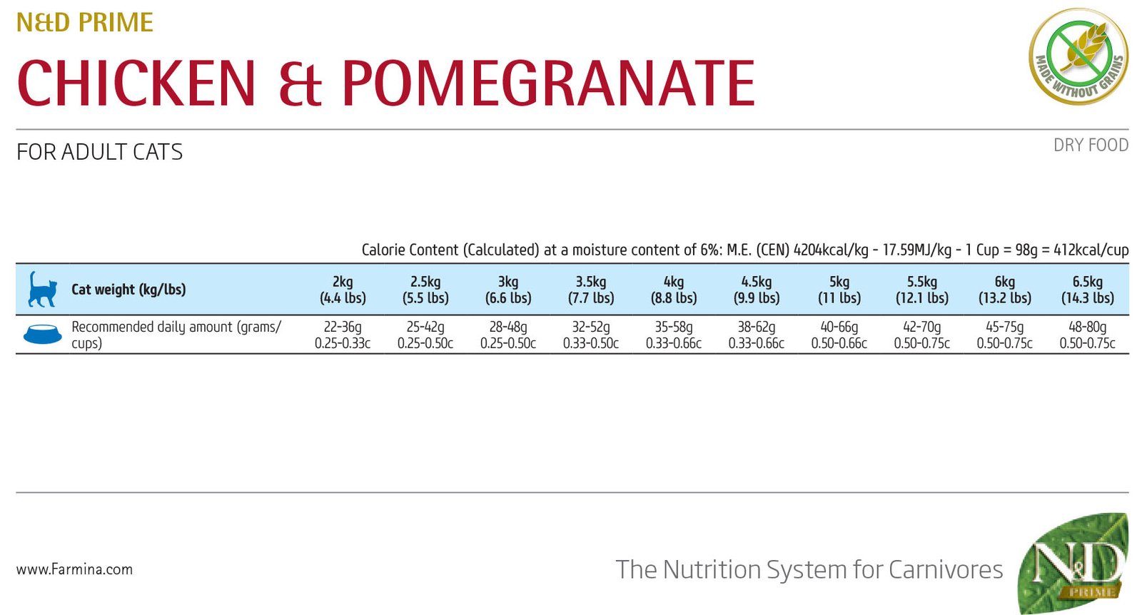 N&D Prime Cat Adult Chicken & Pomegranate – суха храна без зърнени култури за котки над 1 година, с пилешко и нар
