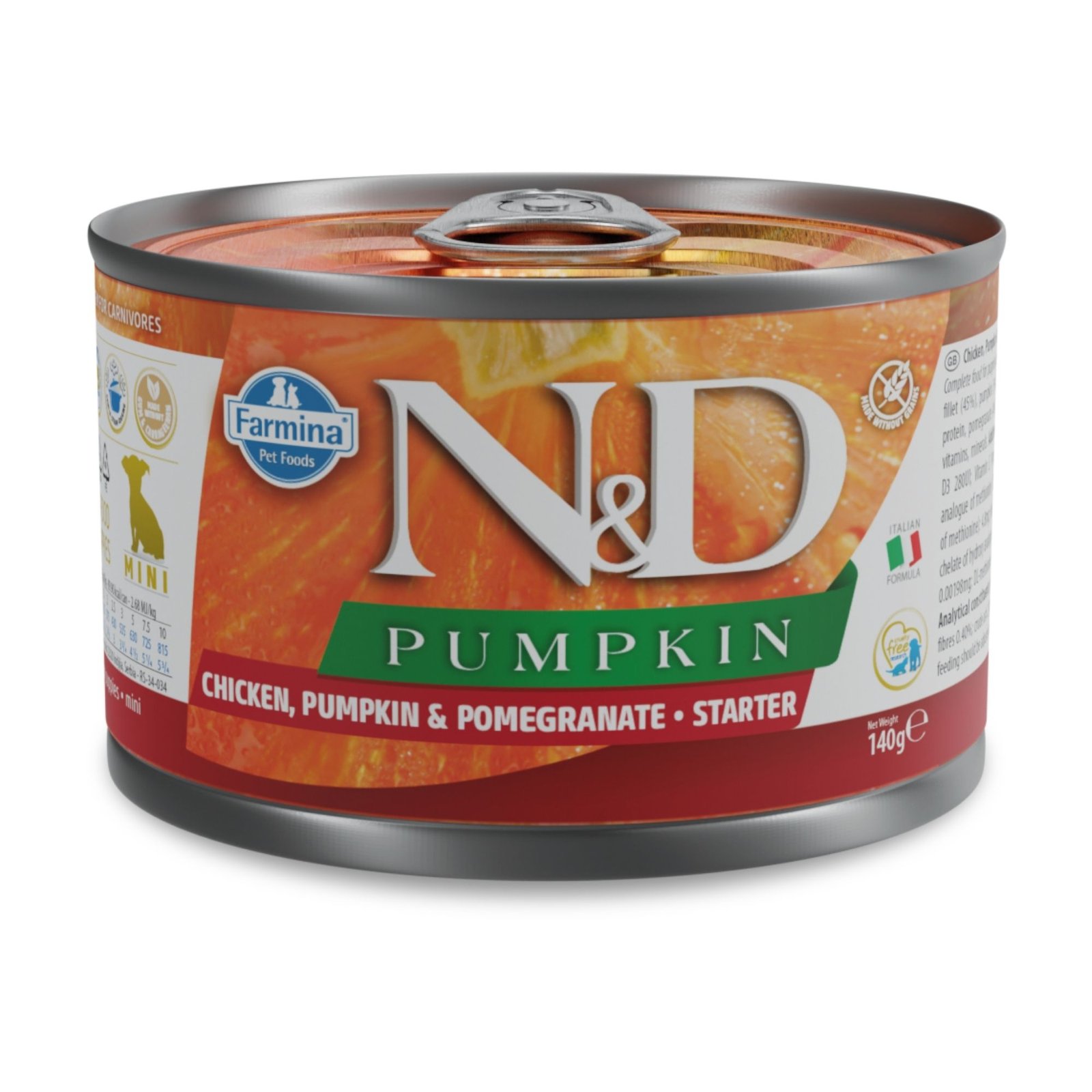 N&D Pumpkin Chicken & Pomegranate Starter Puppy – пълноценна мокра храна без зърнени култури за подрастващи кученца до 2 месеца от дребни породи с пилешко, тиква и нар, консерва 140г.