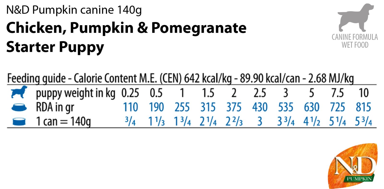 N&D Pumpkin Dog Chicken, Pumpkin & Pomegranate Starter Puppy е пълноценна храна за подрастващи кученца и бременни или кърмещи кучета, формулирана така, че да отговаря на хранителните нужди, установени от AAFCO за периода на растеж. 100% гаранция за удовлетвореност.Здравословна и вкусна храна с подбрани съставки