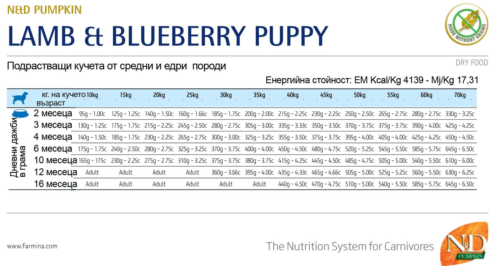 N&D Pumpkin Lamb & Blueberry Puppy Medium&Maxi – суха храна без зърнени култури за подрастващи кученца от средни и едри породи с агнешко, тиква и боровинки