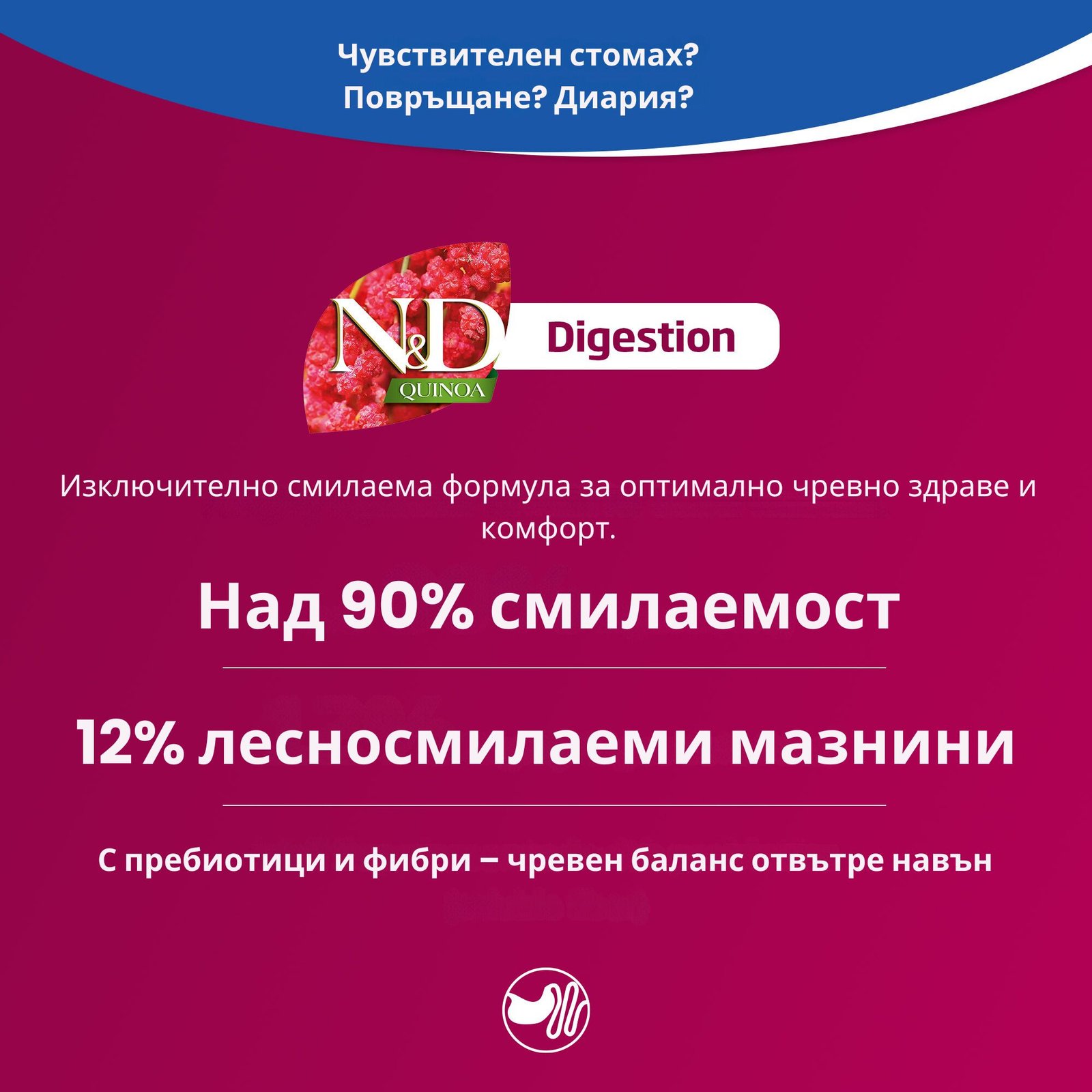 N&D Quinoa Cat Adult Digestion with Lamb – суха храна за добро храносмилане и без зърнени култури за котки, с агнешко, киноа, копър, мента и артишок