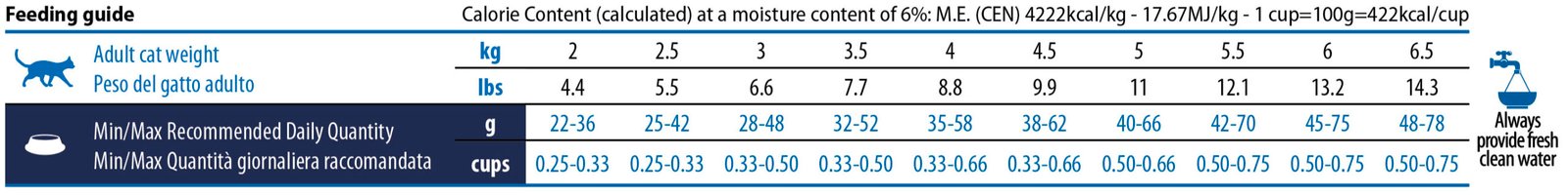 Аналитични съставки: Суров протеин 33.00%; Сурови масла и мазнини 21.50%; Сурови влакнини 1.90%; Влага: 9.00%; Сурова пепел 7.90%; Калций 1.10%; Фосфор 0.90%; Магнезий 0.09%; Омега-6 мастни киселини* 3.30%; Омега-3 мастни киселини* 0.60%; DHA* 0.30%; EPA* 0.15%; Глюкозамин* 1200мг/кг; Хондроитин сулфат* 900мг/кг. * Не се признава за основен хранителен елемент от профилите на хранителните продукти за котки AAFCO.