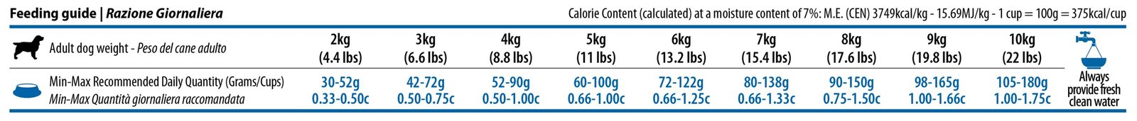 Аналитични съставки: Суров протеин 25,00%; Сурова мазнина 12,00%; Сурови влакнини 1,90%; Влага 9,00%; Сурова пепел 7,50%; Калций 0,90%; Фосфор 0,60%; Натрий 0,40%; Калий 0,60%; Магнезий 0,09%; Омега-6 мастни киселини 1,90%; Омега-3 мастни киселини 0,40%; DHA 0,20%; EPA 0,15%; Глюкозамин 1200мг/кг; Хондроитин сулфат 900мг/кг.