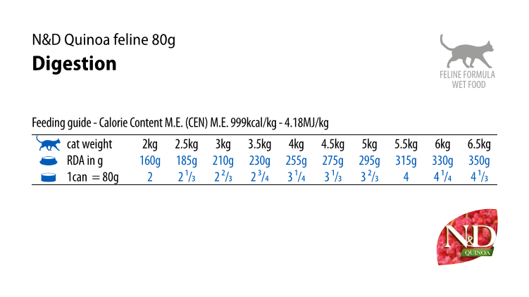 Инструкции за хранене: препоръчва се преди употреба да се потърси мнението на ветеринарен лекар. Лесносмилаема храна. Препоръчителна продължителност на употреба: първоначално до 12 седмици. Сервирайте храната във вида, в който е, като следвате дневните дажби, указани в таблицата. Дневните дажби, показани на приложената схема са само индикативни и може да е необходимо да бъдат регулирани, за да се постигне подходящо телесно тегло. Дневните дажби могат да варират спрямо породата, средата, физическата активност, темперамента или състоянието на тялото. Дневната дажба може да бъде разделяна на две или повече хранения за деня. Препоръчително е първоначално да смесвате N&D със старата храна. По всяко време трябва да има вода в наличност. След като бъде отворена, съхранявайте консервата в хладилник до 48 часа.