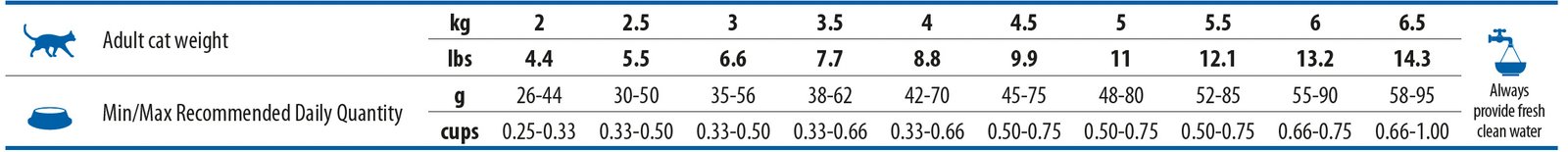 Аналитични съставки: Суров протеин 34.00%; Сурова мазнина 15.00%; Сурови влакнини 8.00%; Влага 8.00%; Сурова пепел 7.60%; Калций 1.00%; Фосфор 0.80%; Натрий 0.30%; Калий 0.60%; Магнезий 0.08%; Омега-6 2.00%; Омега-3 0.50%; DHA 0.15%; EPA 0.10%; Глюкозамин 1200mg/kg; Хондроитин сулфат 900mg/kg. Подкиселяващи урината съставки: калциев сулфат дихидрат 4000mg/kg.