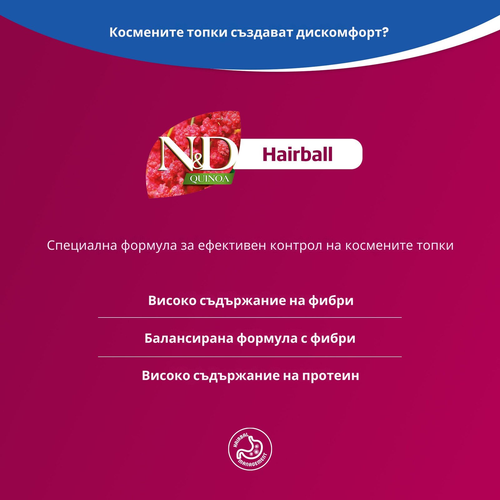 • Противодейства и контролира формирането на космени топки при котките