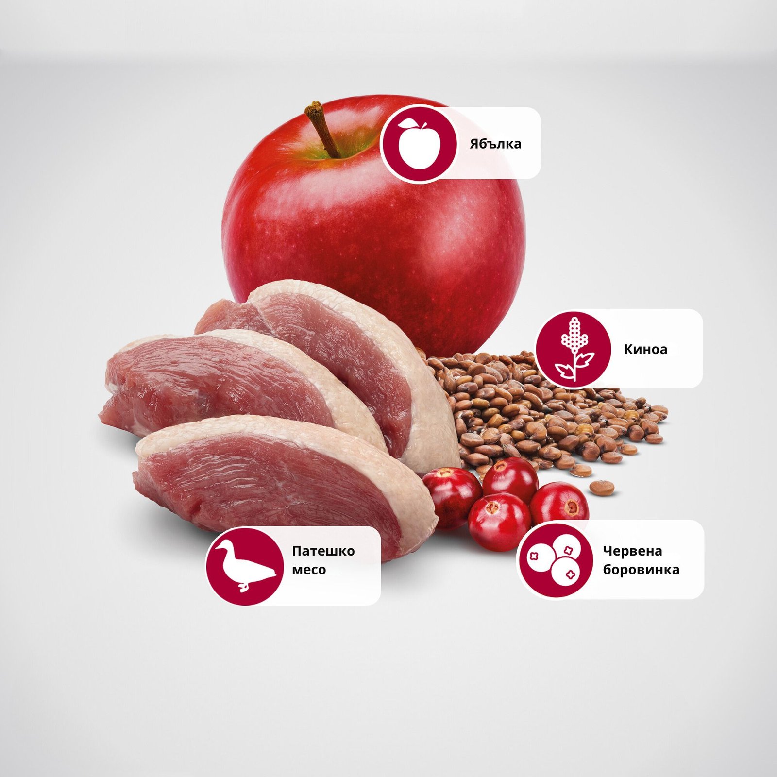 Състав: обезкостено патешко (20%), дехидратиран патешки протеин (20%), нишесте от грах, влакнини от грах, екстрахирано семе от киноа (8%), пилешка мазнина, хидролизиран рибен протеин, изсушени яйца, ленено семе, изсушена цвеклова пулпа, рибено масло (от херинга), изсушена ябълка (2.5%), сушена червена боровинка (2.5%), люспи и семена от псилиум, сушен спанак, брашно от люцерна, фрукто-олигозахариди (0.6%), екстракт от мая (източник на мано-олигозахариди) (0.6%), калциев сулфат дихидрат (0.4%), сушена бирена мая, калиев хлорид, натриев хлорид, екстракт от алое вера, глюкозамин, хондроитин сулфат.