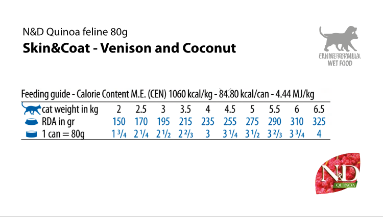 N&D Quinoa Skin & Coat – Venison & Coconut – мокра храна без зърнени култури при хранителни чувствителности, за котки в зряла възраст, с еленско, киноа и кокос, консерва 6 бр. х 80г.