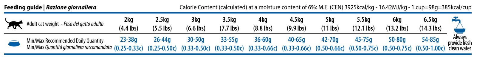 Аналитични съставки: Суров протеин 30.00%; Сурови масла и мазнини 16.00%; Сурови влакнини 2.50%; Влага: 9.00%; Сурова пепел 7.90%; Калций 1.00%; Фосфор 0.80%; Магнезий 0.09%; Омега-6 мастни киселини* 0.80%; Омега-3 мастни киселини* 2.40%; DHA* 1.10%; EPA* 0.80%; Глюкозамин* 1200мг/кг; Хондроитин сулфат* 900мг/кг. * Не се признава за основен хранителен елемент от профилите на хранителните продукти за котки AAFCO.