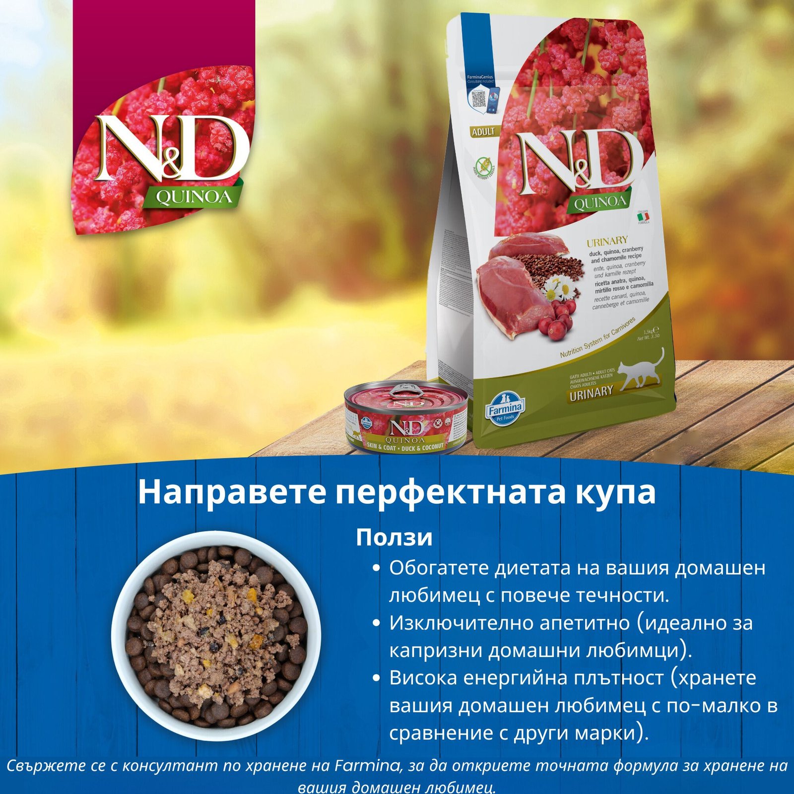 N&D Quinoa Urinary with Duck & Cranberry , Cat Adult – мокра храна без зърнени култури за здрав уринарен тракт, за котки над 1 година, с патешко, киноа, червена боровинка и лайка, консерва