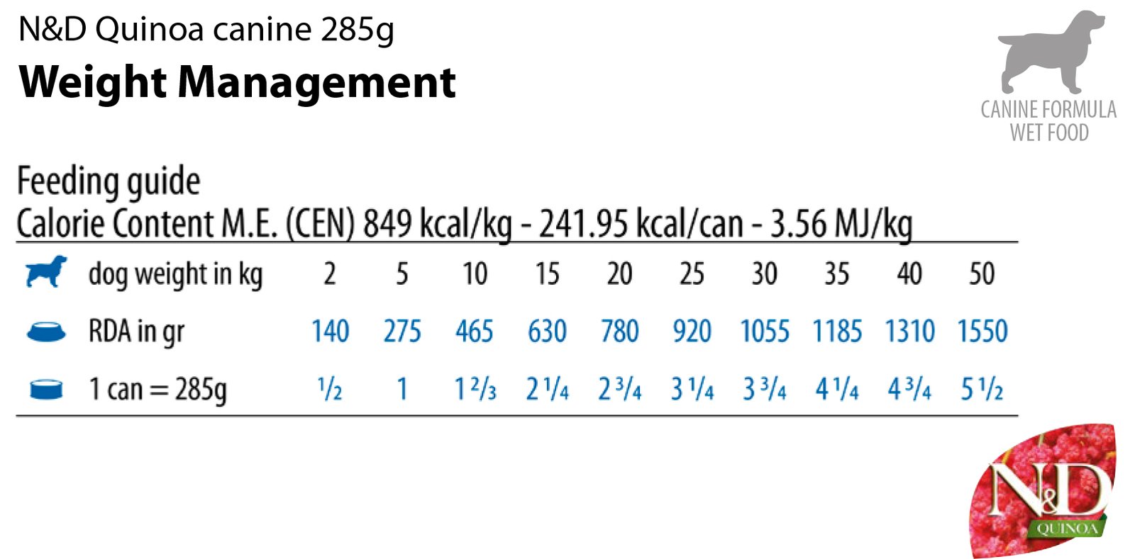 Пълноценна диетична мокра храна без зърнени култури за възстановяване и поддържане на идеално телесно тегло. За кучета от всички породи в зряла възраст над 1 година. Рецепта с агнешко, киноа, броколи и аспержи. N&D Quinoa е формулирана така, че да отговаря на хранителните нужди, установени от AAFCO за поддържане на кучетa в зряла възраст. 100% гаранция за удовлетворение.