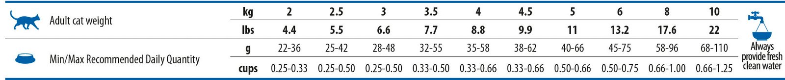 Добавки за кг. Добавъчни храни: Витамин A 18000IU; витамин D3 1200IU; витамин E 600mg; Vвитамин C 300mg; ниацин 150mg; калциев D-пантотенат 50mg; витамин B2 20mg; витамин B6 8,1mg; витамин B1 10mg; биотин 1.5mg; фолиева киселина 1.5mg; витамин B12 0.1mg; холин хлорид 2500mg; бета-каротин 1,5mg; цинк (цинков хелат на хидрокси аналог на метионина): 163,8mg; манган (манганов хелат на хидрокси аналог на метионина): 64,6mg; желязо [железен (II) хелат на глицин хидрат]: 58,3mg; мед (меден хелат на хидрокси аналог на метионина): 15,8mg; DL-метионин, технически чист 5000mg; таурин 4000mg; L-карнитин 300mg. Сензорни добавки: екстракт от зелен чай 100mg; екстракт от розмарин. Антиоксиданти: екстракти на токофероли от растителни масла.