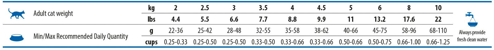 Добавки за кг. Добавъчни храни: Витамин A 18000IU; витамин D3 1200IU; витамин E 600mg; Vвитамин C 300mg; ниацин 150mg; калциев D-пантотенат 50mg; витамин B2 20mg; витамин B6 8,1mg; витамин B1 10mg; биотин 1.5mg; фолиева киселина 1.5mg; витамин B12 0.1mg; холин хлорид 2500mg; бета-каротин 1,5mg; цинк (цинков хелат на хидрокси аналог на метионина): 163,8mg; манган (манганов хелат на хидрокси аналог на метионина): 64,6mg; желязо [железен (II) хелат на глицин хидрат]: 58,3mg; мед (меден хелат на хидрокси аналог на метионина): 15,8mg; DL-метионин, технически чист 5000mg; таурин 4000mg; L-карнитин 300mg. Сензорни добавки: екстракт от зелен чай 100mg; екстракт от розмарин. Антиоксиданти: екстракти на токофероли от растителни масла.