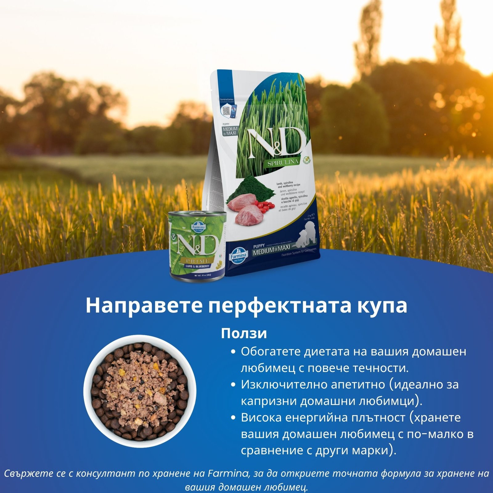 N&D Spirulina Lamb & Wolfberry Puppy MINI – суха храна без зърнени култури за подрастващи кученца от мини породи с агнешко, спирулина и годжи бери