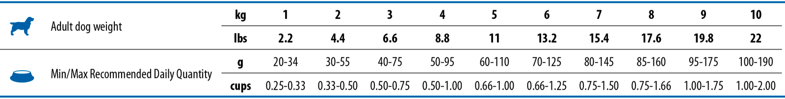 Състав: сьомга (20%), дехидратиран протеин от сьомга (20%), спелта (12%), овесени ядки (12%), рибено масло (от херинга), дехидратиран протеин от херинга, сушена пулпа от цвекло, сушени моркови, брашно от люцерна, инулин, фруктоолигозахариди , екстракт от дрожди (източник на мано-олигозахариди), сушен банан (0,5%), сушено киви (0,5%), сушено манго (0,5%), сушена папая (0,5%), сушен ананас (0,5%), сушен спанак , люспи и семена от псилиум, натриев хлорид, суха бирена мая, куркума, екстракт от алое вера, глюкозамин, хондроитин сулфат.