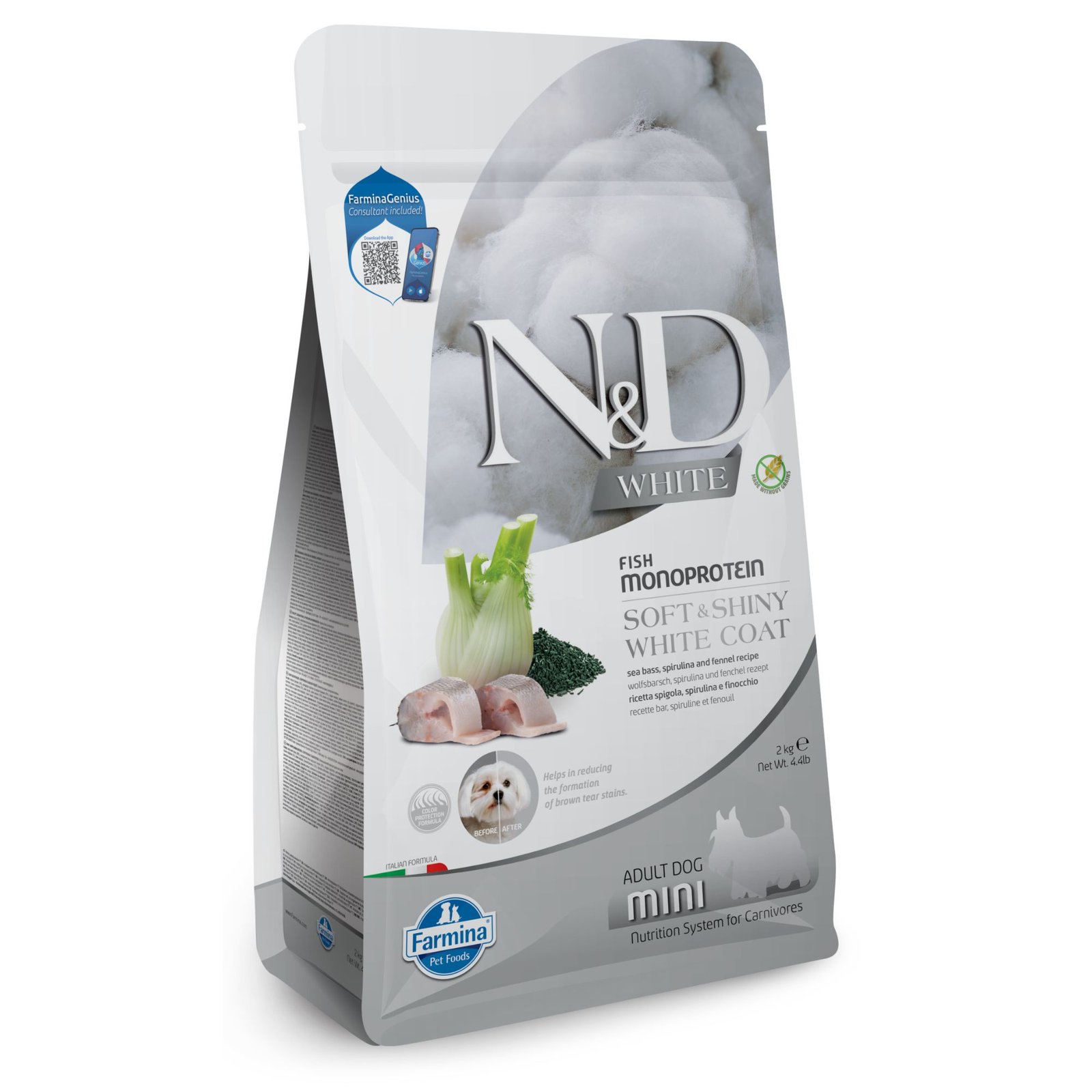 N&D White Dog Sea Bass, Spirulina & Fennel Adult MINI – монопротеинова суха храна без зърнени култури за кучета с бяла козина от мини породи над 1 година, с лаврак, спирулина и фенел
