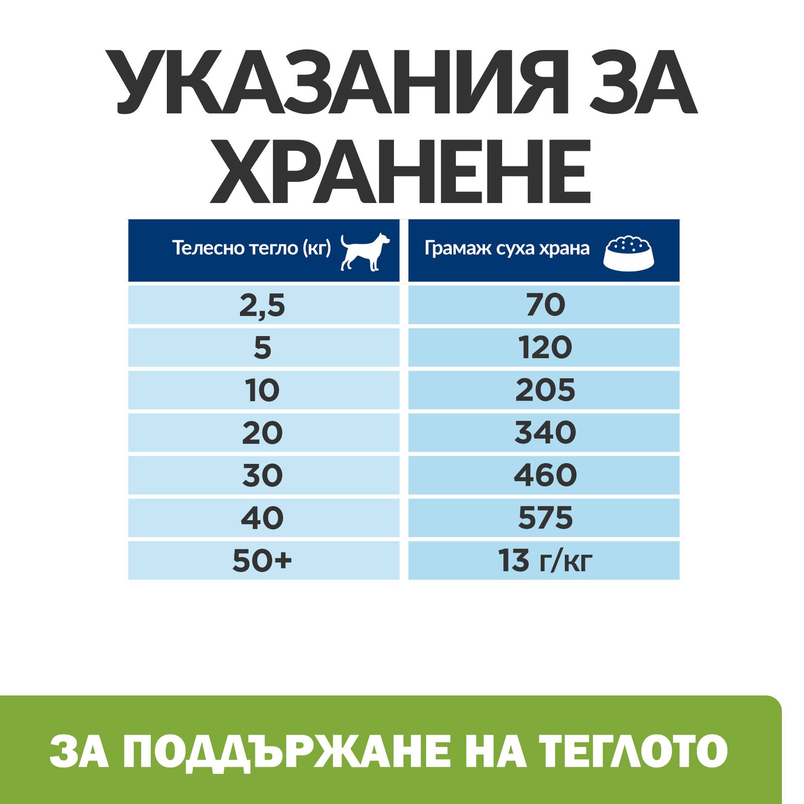 Давайте само препоръчаната храна PRESCRIPTION DIET. Преди употреба поискайте от ветеринарния лекар да ви даде конкретни указания за храненето на вашия домашен любимец. Вижте указанията за хранене на опаковката. Дневните препоръчителни дажби са само ориентировъчни. При съмнение се консултирайте с ветеринарен лекар. Винаги оставяйте прясна вода за пиене.