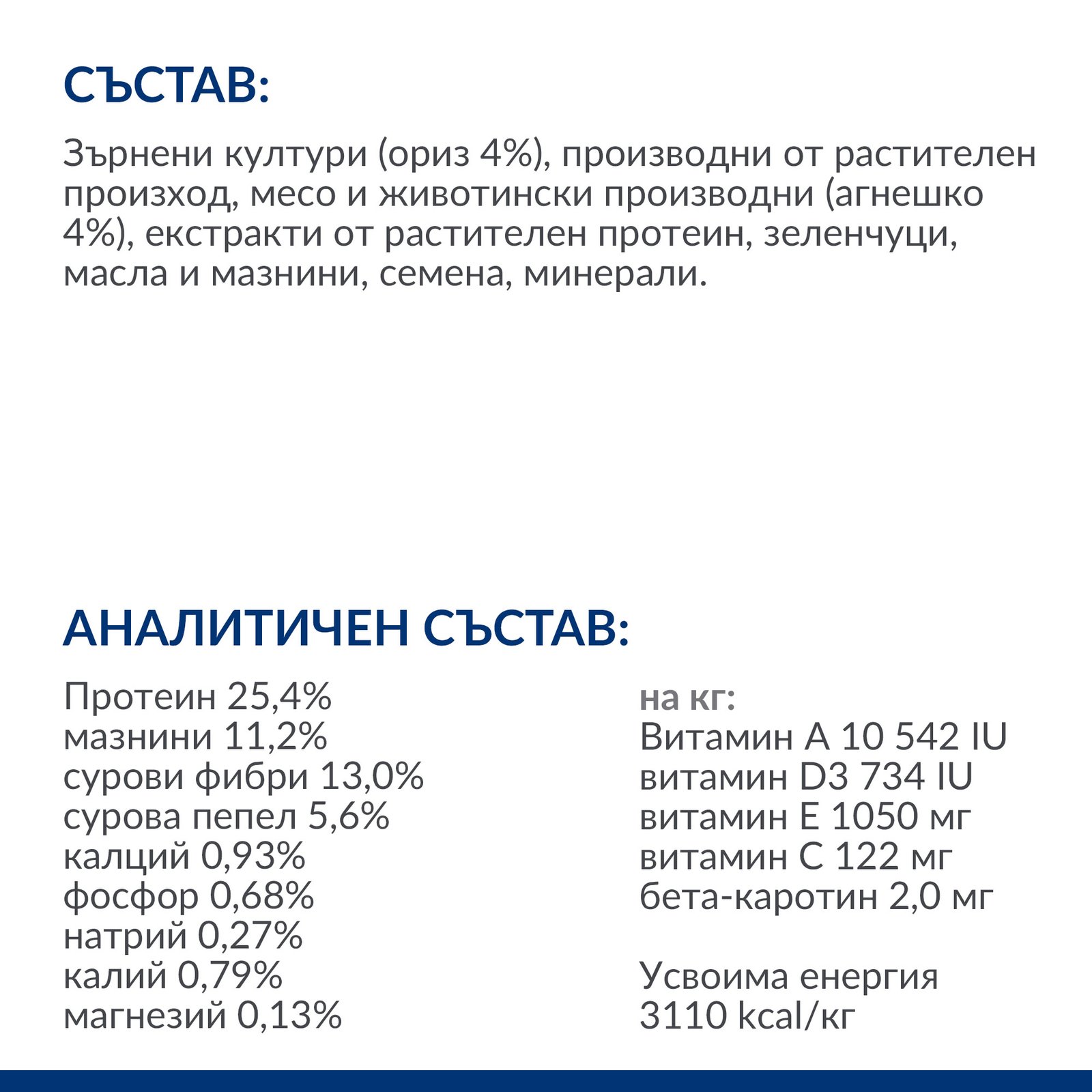 СЪСТАВ: Зърнени култури (ориз 4%), производни от растителен произход, месо и животински производни (агнешко 4%), екстракти от растителен протеин, зеленчуци, масла и мазнини, семена, минерали.