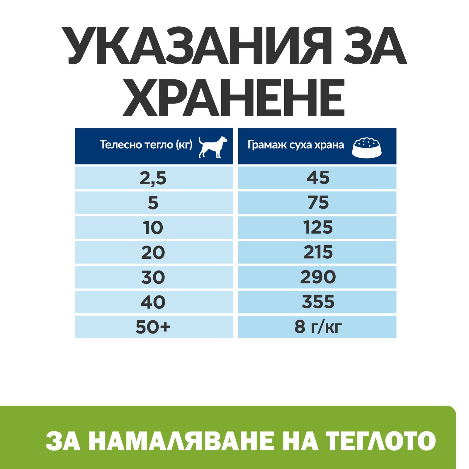 Важно е да продължите да храните кучето си с PRESCRIPTION DIET Metabolic Weight Management и след достигане на идеалното тегло, за да може то да бъде поддържано. Редовно водете кучето си на ветеринарен лекар, за да сте сигурни, че е здраво.