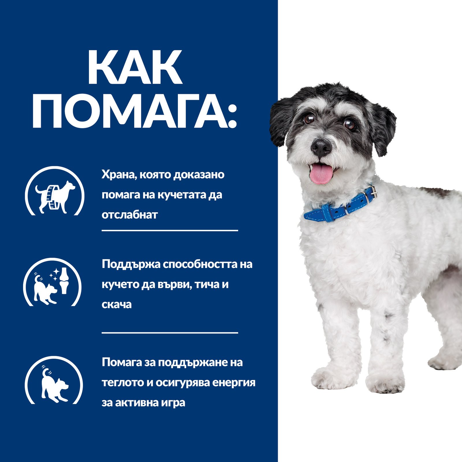 Важно е да продължите да храните кучето си с PRESCRIPTION DIET Metabolic + Mobility Mini и след достигане на идеалното тегло, за да поддържате теглото и подвижността му. Вашият ветеринарен лекар ще ви разкаже повече за това как храните PRESCRIPTION DIET могат да допринесат за един щастлив и активен живот.