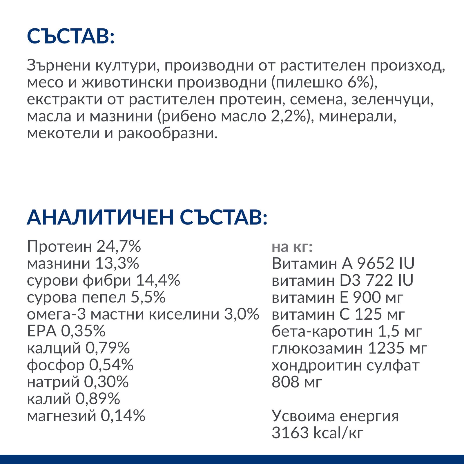 АНАЛИТИЧЕН СЪСТАВ: Протеин 24,7%, мазнини 13,3%, сурови фибри 14,4%, сурова пепел 5,5%, омега-3 мастни киселини 3,0%, EPA 0,35%, калций 0,79%, фосфор 0,54%, натрий 0,30%, калий 0,89%, магнезий 0,14%; на кг: Витамин A 9652 IU, витамин D3 722 IU, витамин E 900 мг, витамин C 125 мг, бета-каротин 1,5 мг, глюкозамин 1235 мг, хондроитин сулфат 808 мг.