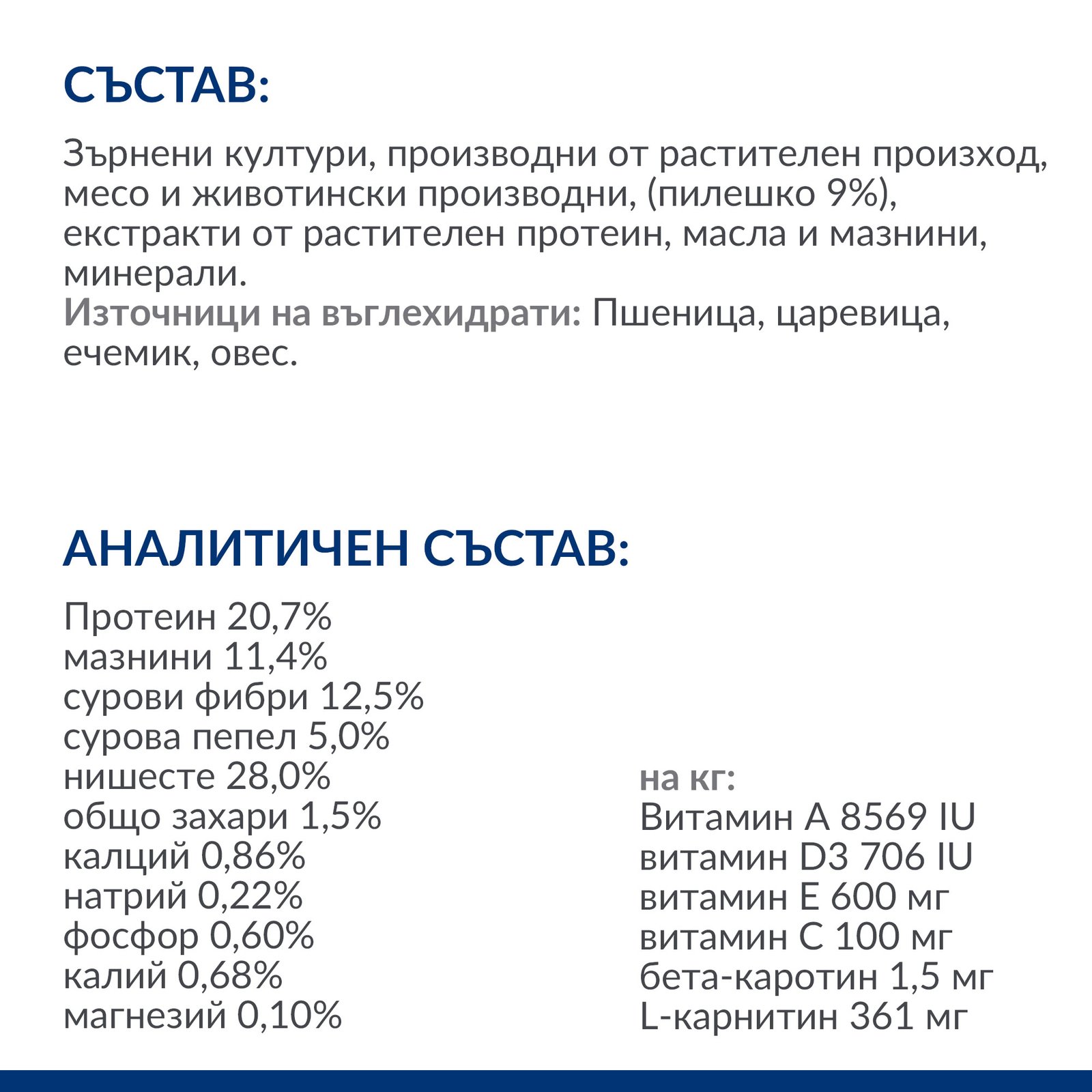 СЪСТАВ: Зърнени култури, производни от растителен произход, месо и животински производни, (пилешко 9%), екстракти от растителен протеин, масла и мазнини, минерали. Източници на въглехидрати: Пшеница, царевица, ечемик, овес.