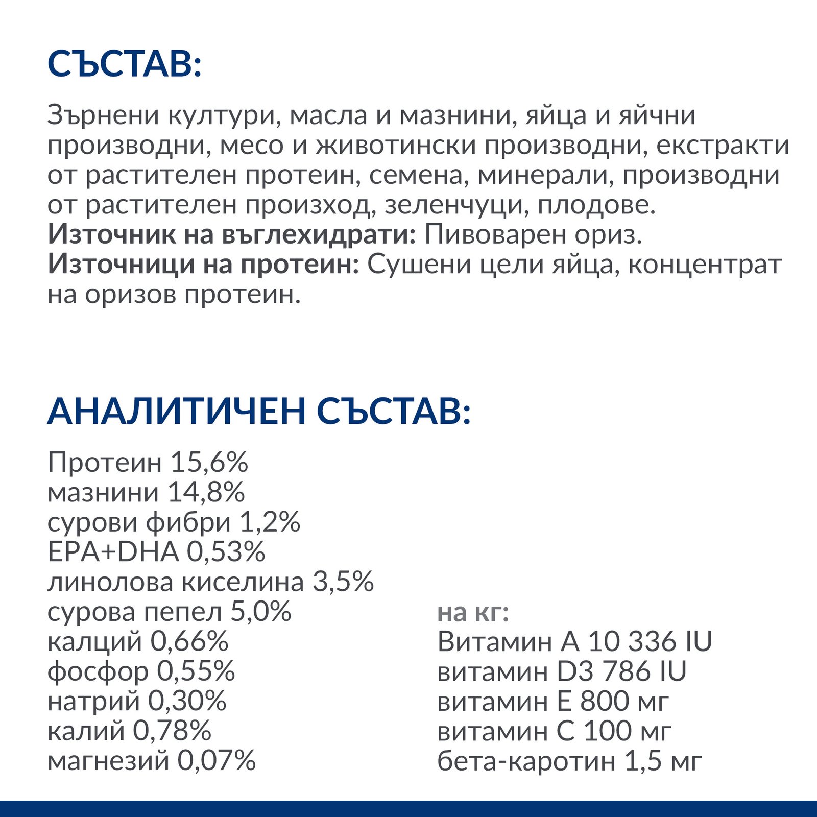 АНАЛИТИЧНИ СЪСТАВКИ: Протеин 15,6%, мазнини 14,8%, сурови фибри 1,2%, EPA+DHA 0,53%, линолова киселина 3,5%, сурова пепел 5,0%, калций 0,66%, фосфор 0,55%, натрий 0,30%, калий 0,78%, магнезий 0,07%; на кг: Витамин A 10 336 IU, витамин D3 786 IU, витамин E 800 мг, витамин C 100 мг, бета-каротин 1,5 мг.