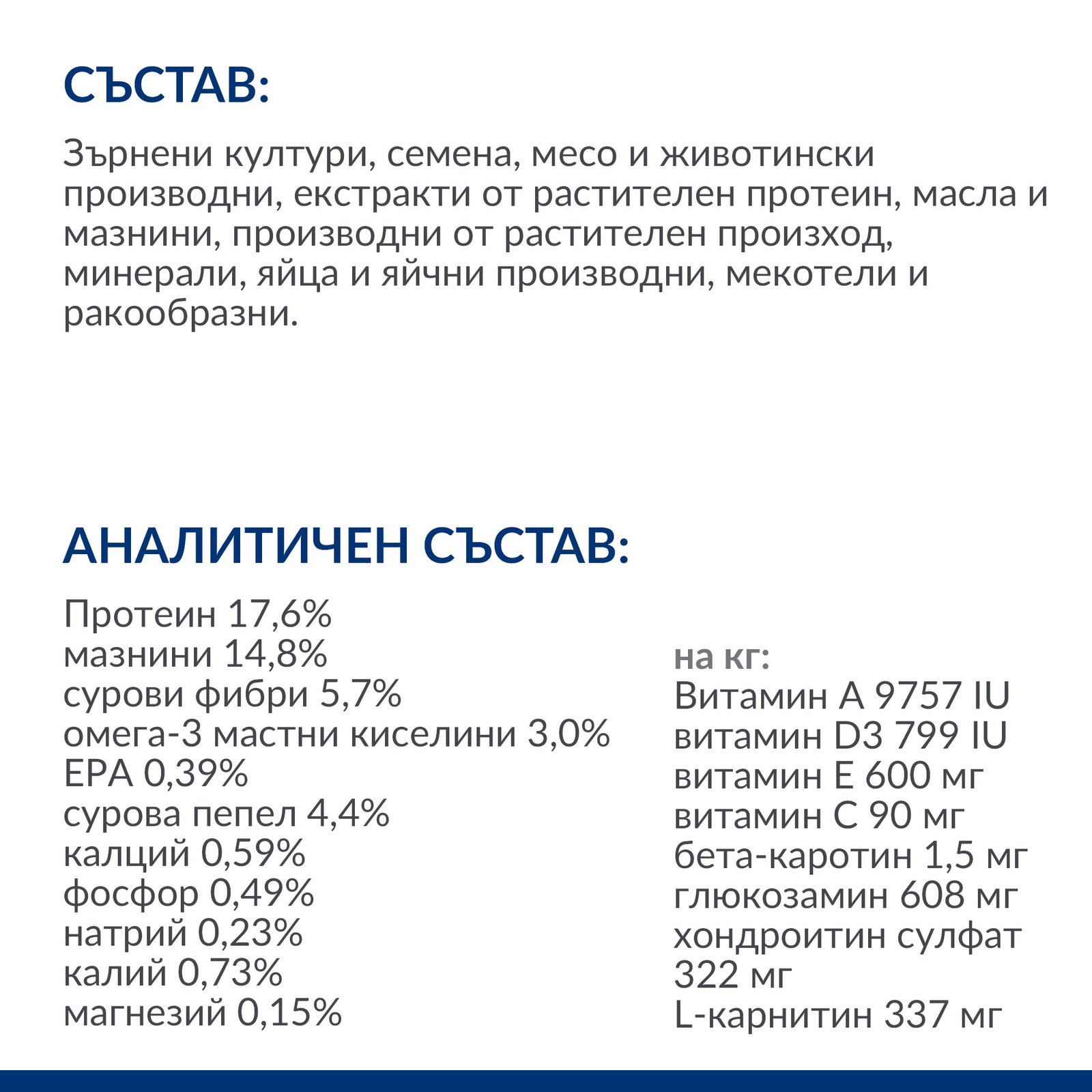АНАЛИТИЧЕН СЪСТАВ: Протеин 17,6%, мазнини 14,8%, сурови фибри 5,7%, омега-3 мастни киселини 3,0%, EPA 0,39%, сурова пепел 4,4%, калций 0,59%, фосфор 0,49%, натрий 0,23%, калий 0,73%, магнезий 0,15%; на кг: Витамин A 9757 IU, витамин D3 799 IU, витамин E 600 мг, витамин C 90 мг, бета-каротин 1,5 мг, глюкозамин 608 мг, хондроитин сулфат 322 мг, L-карнитин 337 мг.
