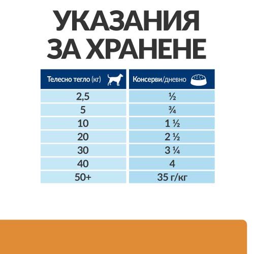 Давайте само препоръчаната храна PRESCRIPTION DIET. Преди употреба поискайте от ветеринарния лекар да ви даде конкретни указания за храненето на вашия домашен любимец. Вижте указанията за хранене на опаковката. Дневните препоръчителни дажби са само ориентировъчни. При съмнение се консултирайте с ветеринарен лекар. Винаги оставяйте прясна вода за пиене.