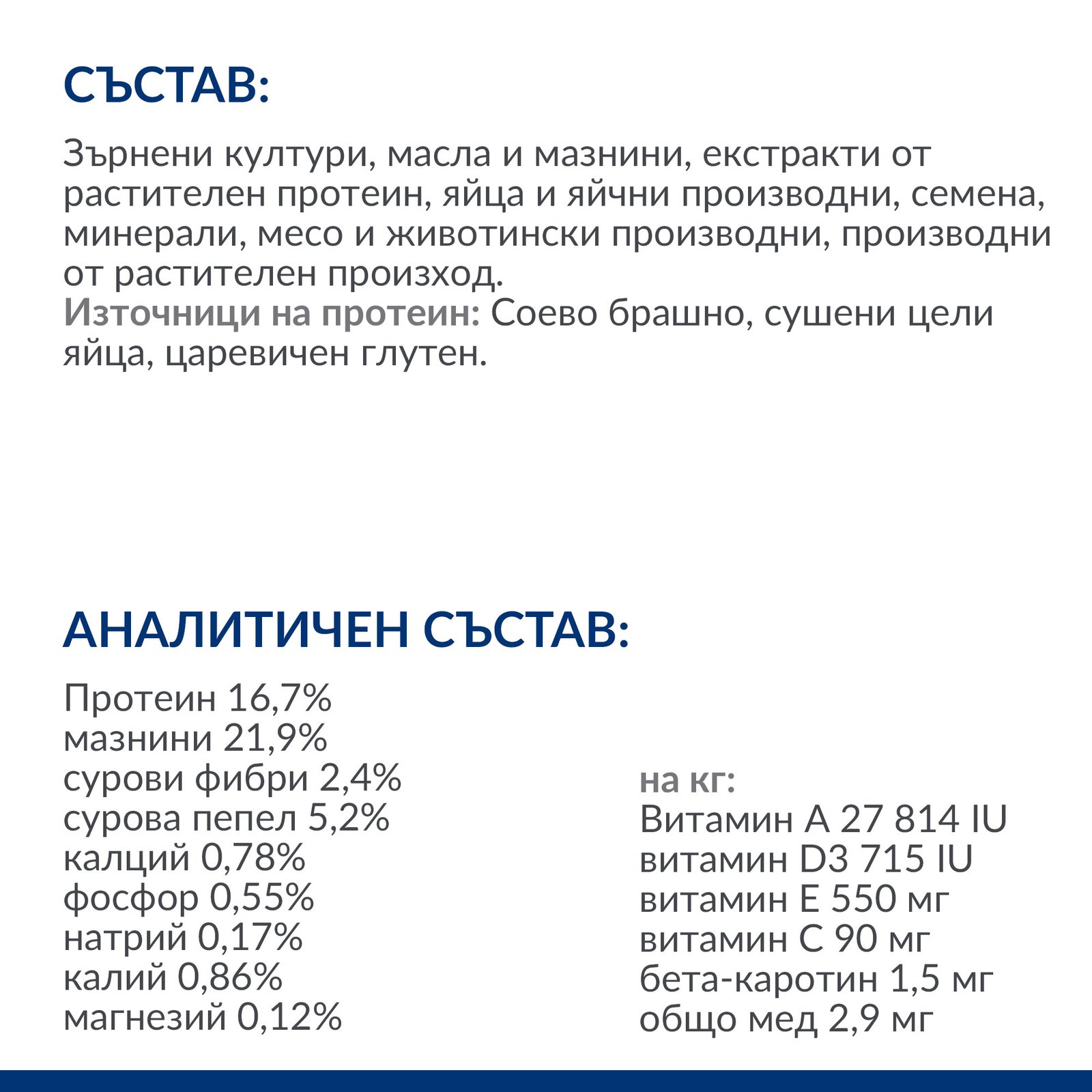 АНАЛИТИЧЕН СЪСТАВ: Протеин 16,7%, мазнини 21,9%, сурови фибри 2,4%, сурова пепел 5,2%, калций 0,78%, фосфор 0,55%, натрий 0,17%, калий 0,86%, магнезий 0,12%; на кг: Витамин A 27 814 IU, витамин D3 715 IU, витамин E 550 мг, витамин C 90 мг, бета-каротин 1,5 мг, общо мед 2,9 мг.