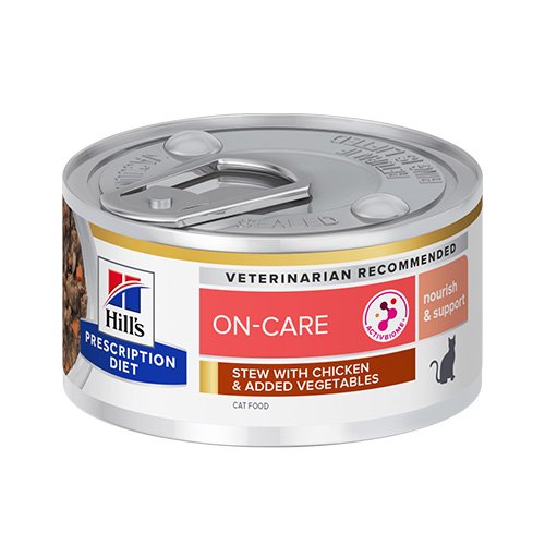 Hill’s Prescription Diet On-Care Stew с пилешко и добавени зеленчуци е пълноценна диетична храна за израснали котки за хранително възстановяване (реконвалесценция). Тази храна е с висока енергийна плътност, висока концентрация на незаменими хранителни вещества и лесносмилаеми съставки.