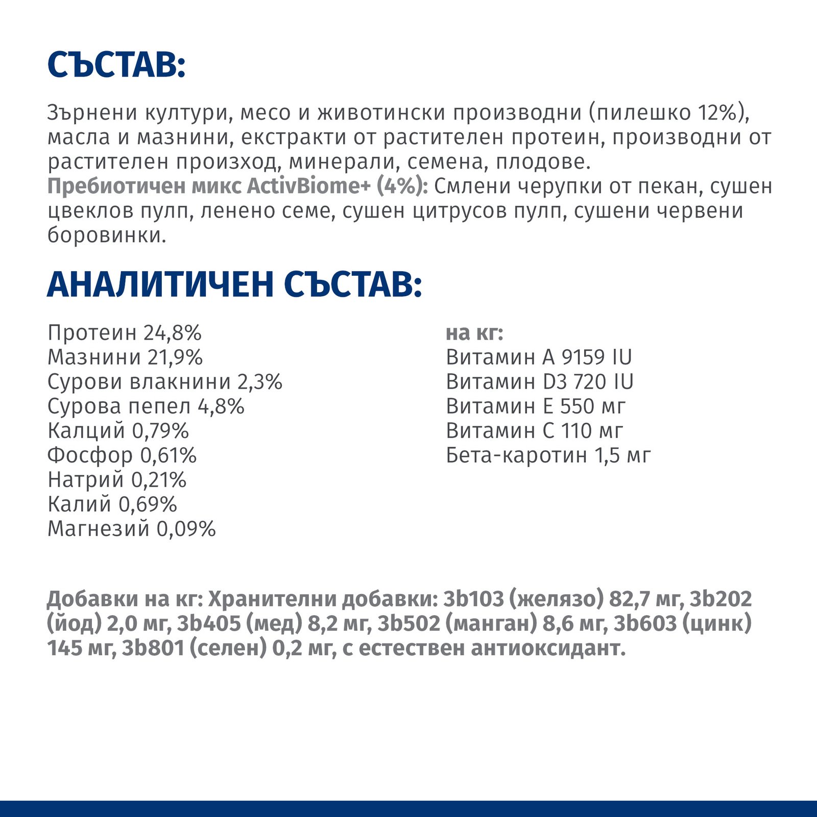 СЪСТАВ: Зърнени култури, месо и животински производни (пилешко 15%), масла и мазнини, екстракти от растителен протеин, производни от растителен произход, минерали, плодове, семена. Пребиотичен микс ActivBiome+ (4%): Смлени черупки от пекан, сушена цвеклова пулпа, ленено семе, сушен цитрусова пулпа, сушени червени боровинки. Лесносмилаеми съставки: Пилешки и пуешки дехидратиран протеин, пшеница, животински мазнини, царевица, брашно от царевичен глутен, овкусител от животински произход, рибено масло, растително масло.