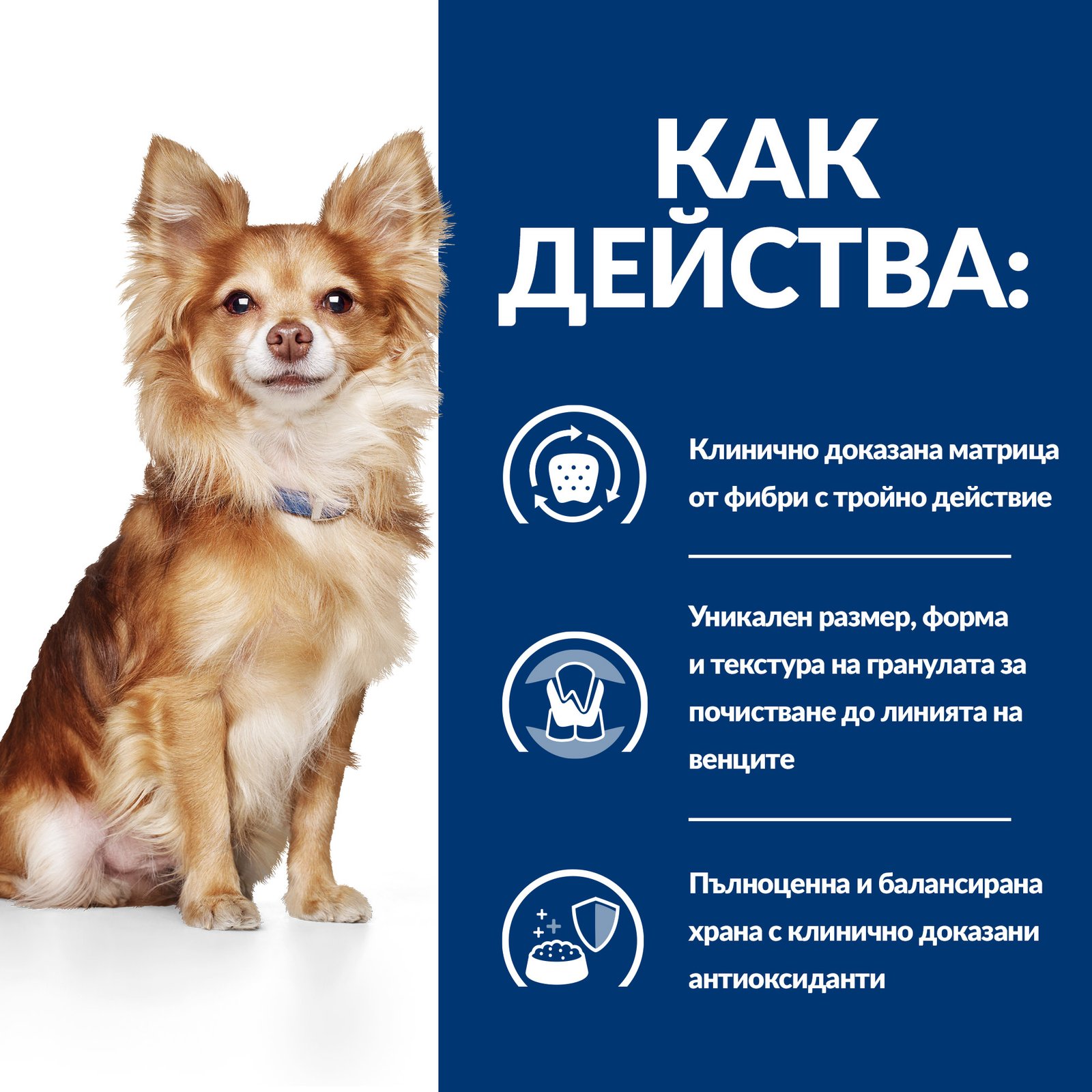 Храната за кучета Hill's PRESCRIPTION DIET t/d Mini е специално формулирана от хранителните експерти и ветеринарните лекари на Hill’s намаляване на плаката, петната и зъбния камък.